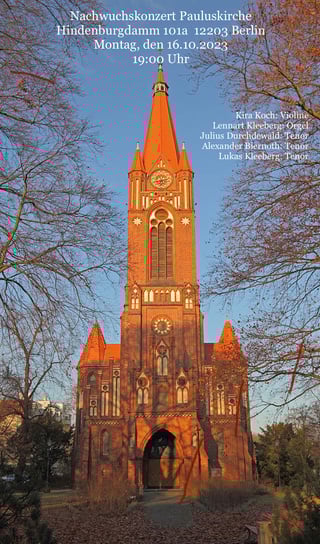 Lennart Kleeberg ist 2007 geboren. Mit 6 Jahren begann er mit dem Klavierspielen, seit 2018 wird er von Karla Haltenwanger unterrichtet. Er hat am Klavier mehrmals sowohl solistisch als auch vierhändig sowie mit einem Hornpartner und an der Orgel an Jugend Musiziert teilgenommen, den Bundeswettbewerb erreicht und dort einen 1. Preis und zweimal 2. Preise errungen. 2023 nahm er am Carl-Schröder-Wettbewerb teil, erreichte dort den 1. Preis und einen Sonderpreis. 2024 gewann er dort an der Orgel einen 1. Preis und den Carl-Schröder-Preis und als Begleiter zusammen mit Alexander einen 1. Preis in der Kategorie Gesang. Seit 2015 ist Lennart Sänger des Staats-und Domchores Berlin. Er sang davon 3,5 Jahre als Knabe im Konzertchor sowie in der Kleingruppen-auswahl, mit der er Konzertreisen unter anderem nach London, Greifswald und Mönchengladbach unternahm. Seit 2021 spielt Lennart Orgel. Ab Januar 2023 wurde er von Prof. Dr. Andreas Sieling unterrichtet. Im Juni 2023 bestand er die Aufnahmeprüfung als Jungstudent an das Julius-Stern-Institut an der Universität der Künste. Seitdem hat er auch eine Vielzahl kirchlicher Veranstaltungen musikalisch begleitet.